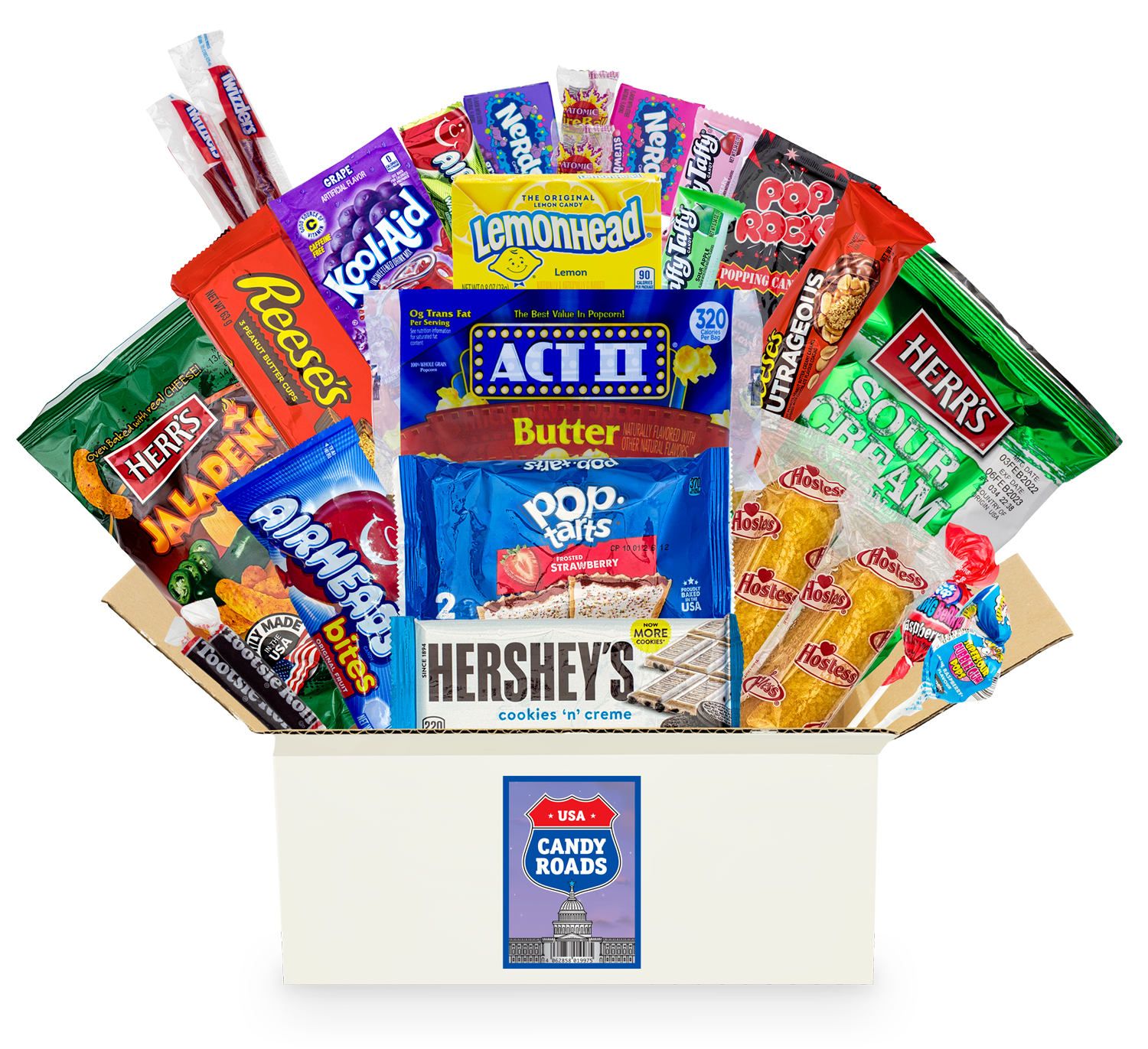 The Candy Roads Box takes you on a journey across the states of the USA. The 25 possible sweets and snacks include Twinkies, Nerds, Herr's Chips, Twizzlers or the famous Hershey's chocolate.