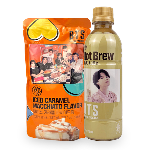 Genieße schwarzen Eiskaffee und den süßen Geschmack von Karamell oder Haselnuss. Mit den Iced Coffee BTS-Editionen kommen K-Pop Fans voll auf ihre Kosten.