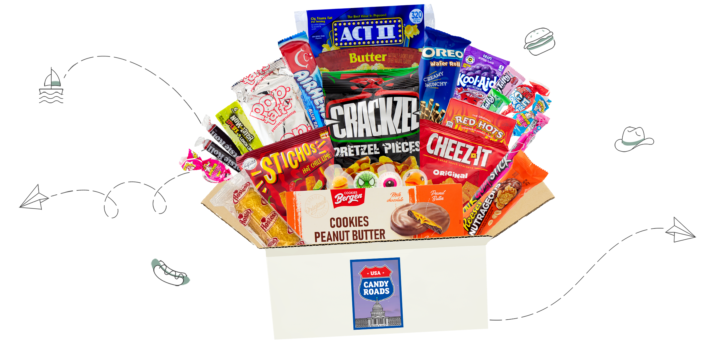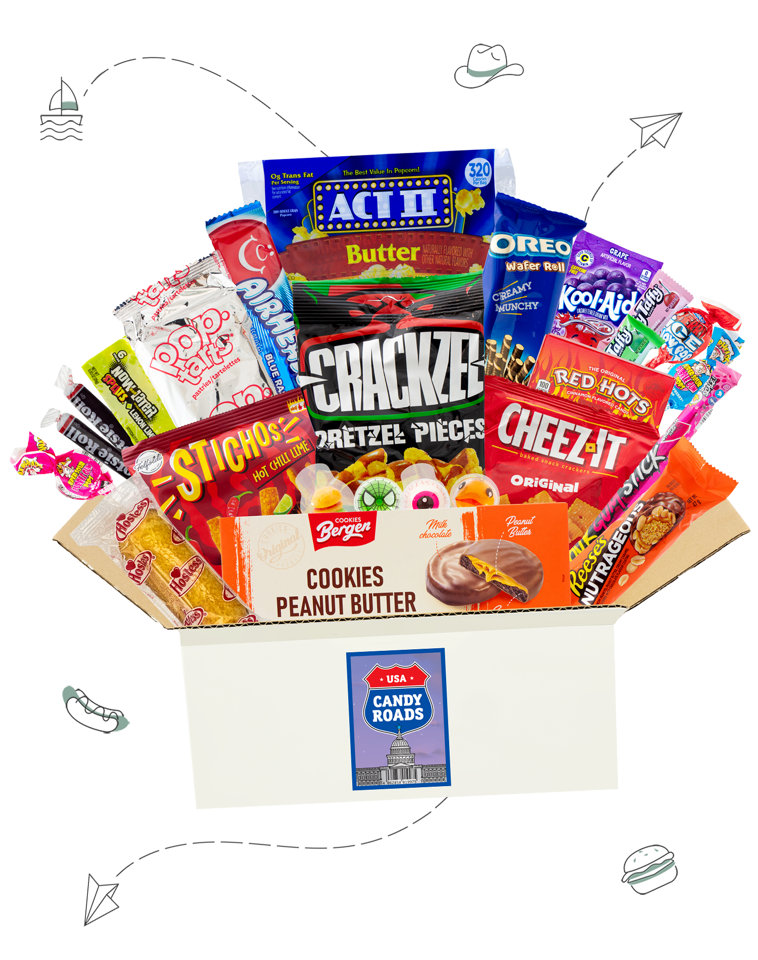 The 25 selected snacks in your Candy Roads box vary every few months depending on particular trends and seasons. These typical American delicacies could be in your box:
