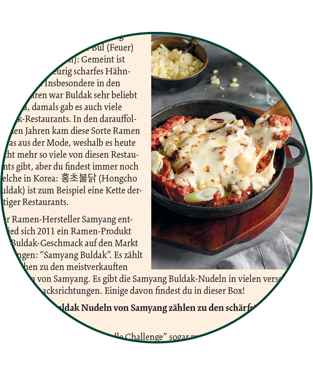 Die koreanische Landesküche ist unter anderem für ihre scharfen Gerichte bekannt, Instant-Nudeln sind da keine Ausnahme. In dem beiliegenden Guksu-Magazin erfährst du daher interessante Fakten über die koreanische Esskultur und die Entstehungsgeschichte von Samyang Buldak Nudeln.