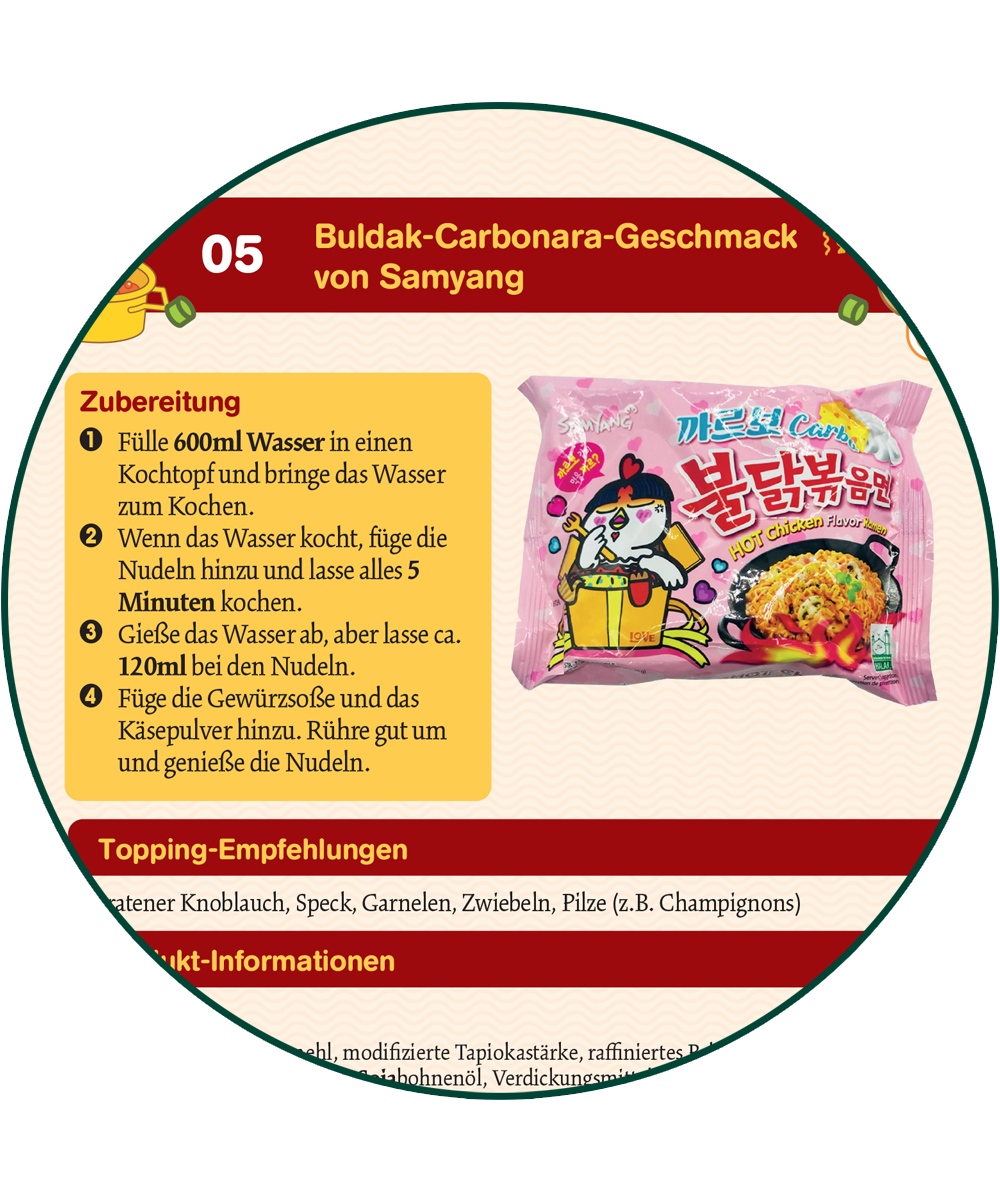 Die Broschüre enthält interessantes Hintergrundwissen rund um Samyang und die berühmten Buldak-Ramen. Du findest darin auch alle wichtigen Informationen zu deinen Nudelsorten und bekommst praktische Tipps zur Zubereitung.