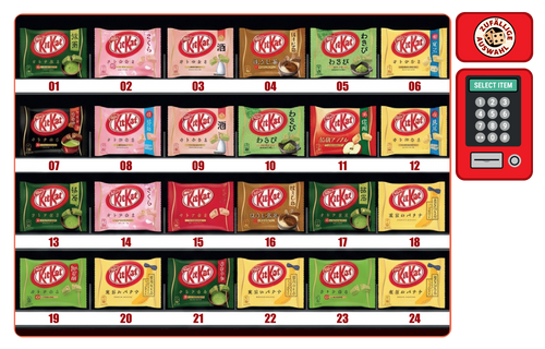 Der Sortenmix enthält leckere und abwechslungsreiche Geschmacksrichtungen, die direkt aus Japan importiert wurden und im regulären deutschen Handel kaum erhältlich sind. Zu den unzähligen möglichen Schokoladenriegeln in der Box gehören z.B. typisch japanische Matcha und Daifuku KitKat Varianten, fruchtige Sorten mit Orange, Apfel oder Erdbeere, Variationen mit verschiedenen Nüssen und Beeren und viele weitere neue und beliebte Kombinationen.
