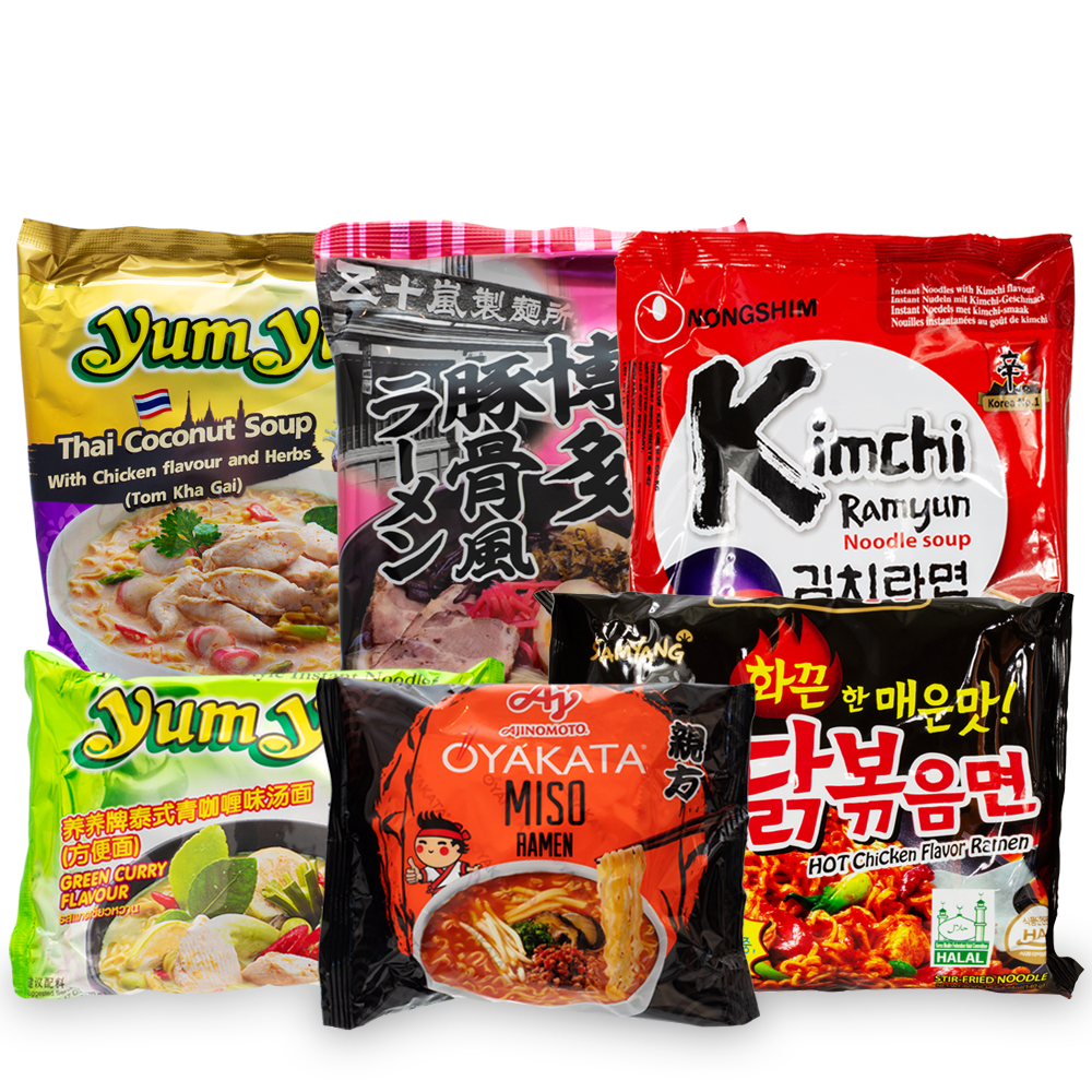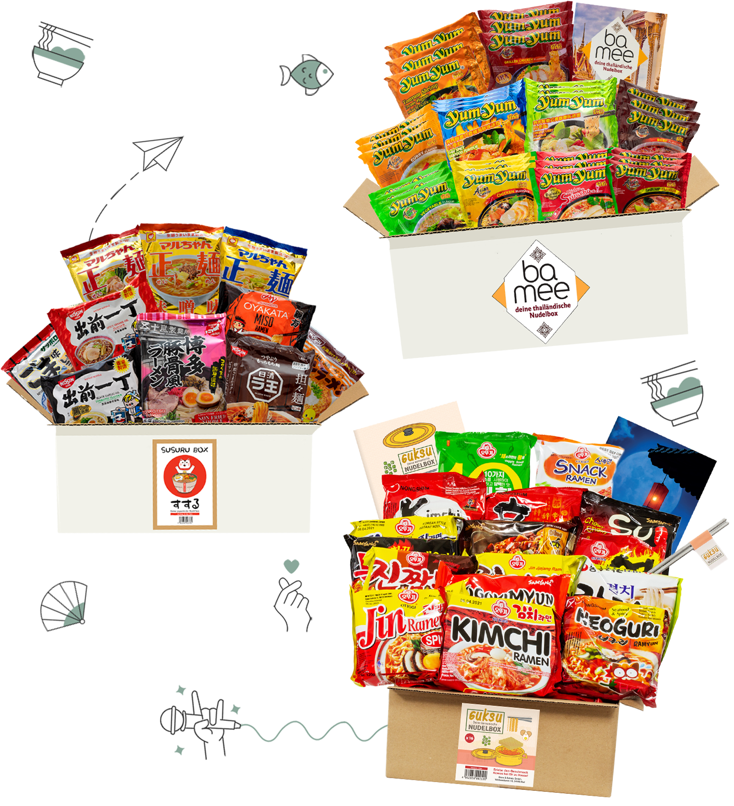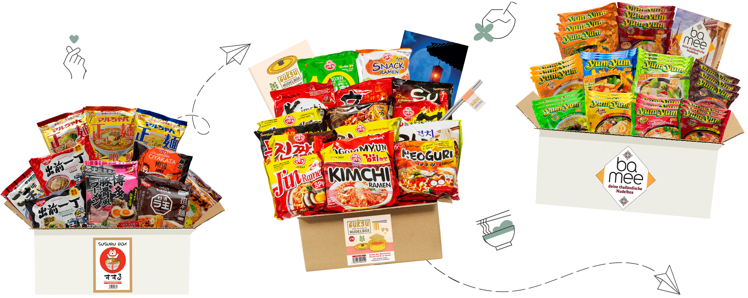 The set also includes these delicious noodle boxes: The Ba Mee YumYum Box with 30 Thai instant noodles , the Guksu Box with 16 ramyun specialties from South Korea and the Susuru Box with 10 typical Japanese ramen varieties .