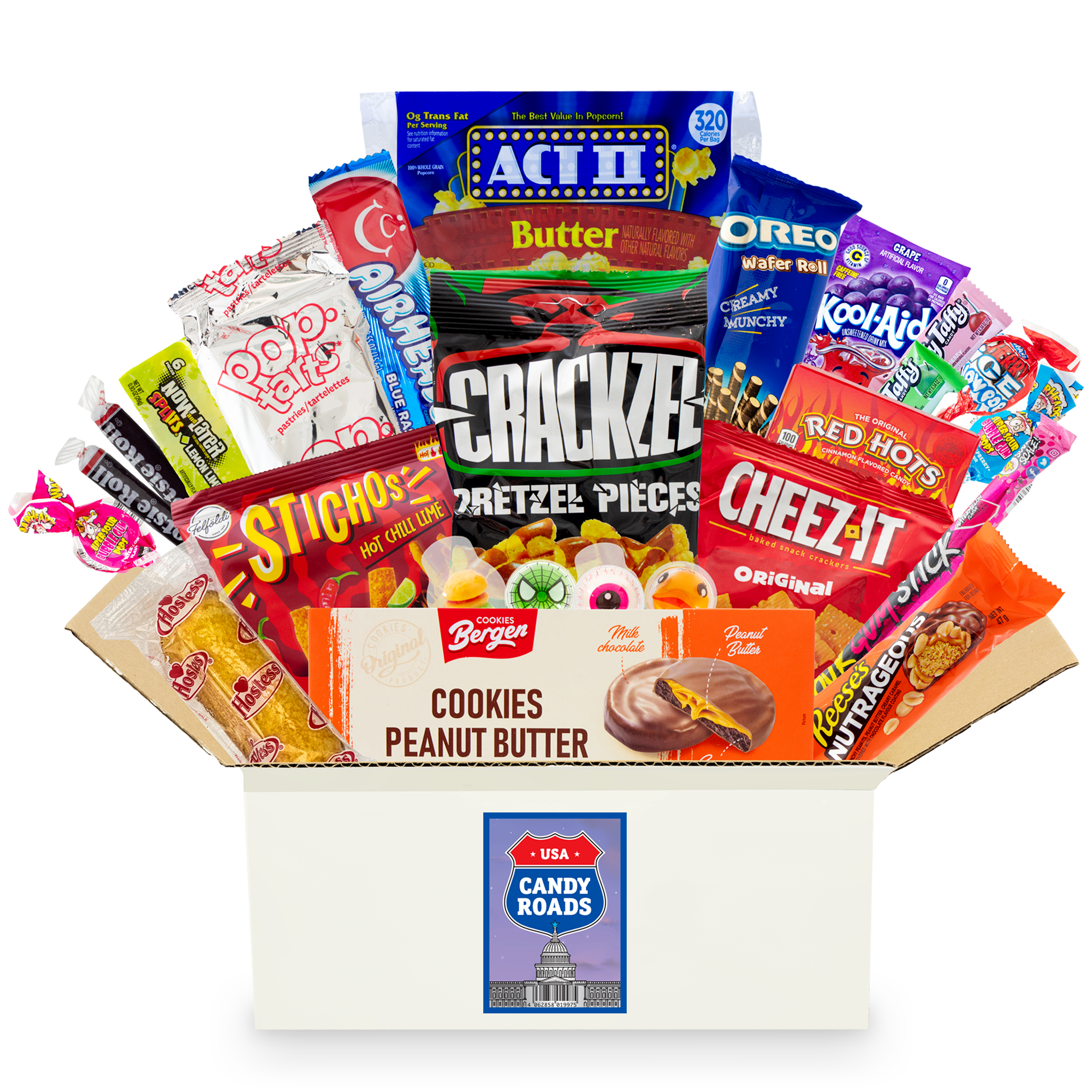 Die Candy Roads Box nimmt dich mit auf eine Reise quer durch die Bundesstaaten der USA. Zu den über 20 möglichen Süßigkeiten und Snacks gehören z.B. Twinkies, Nerds, Herr's Chips, Twizzlers oder die berühmte Hershey's Schokolade.