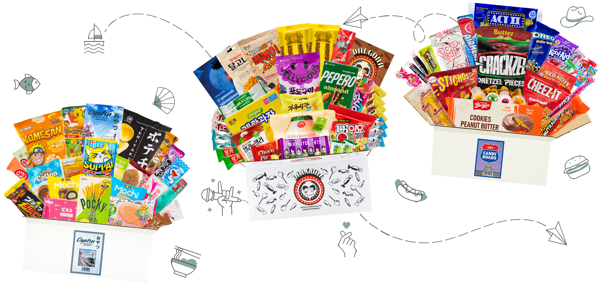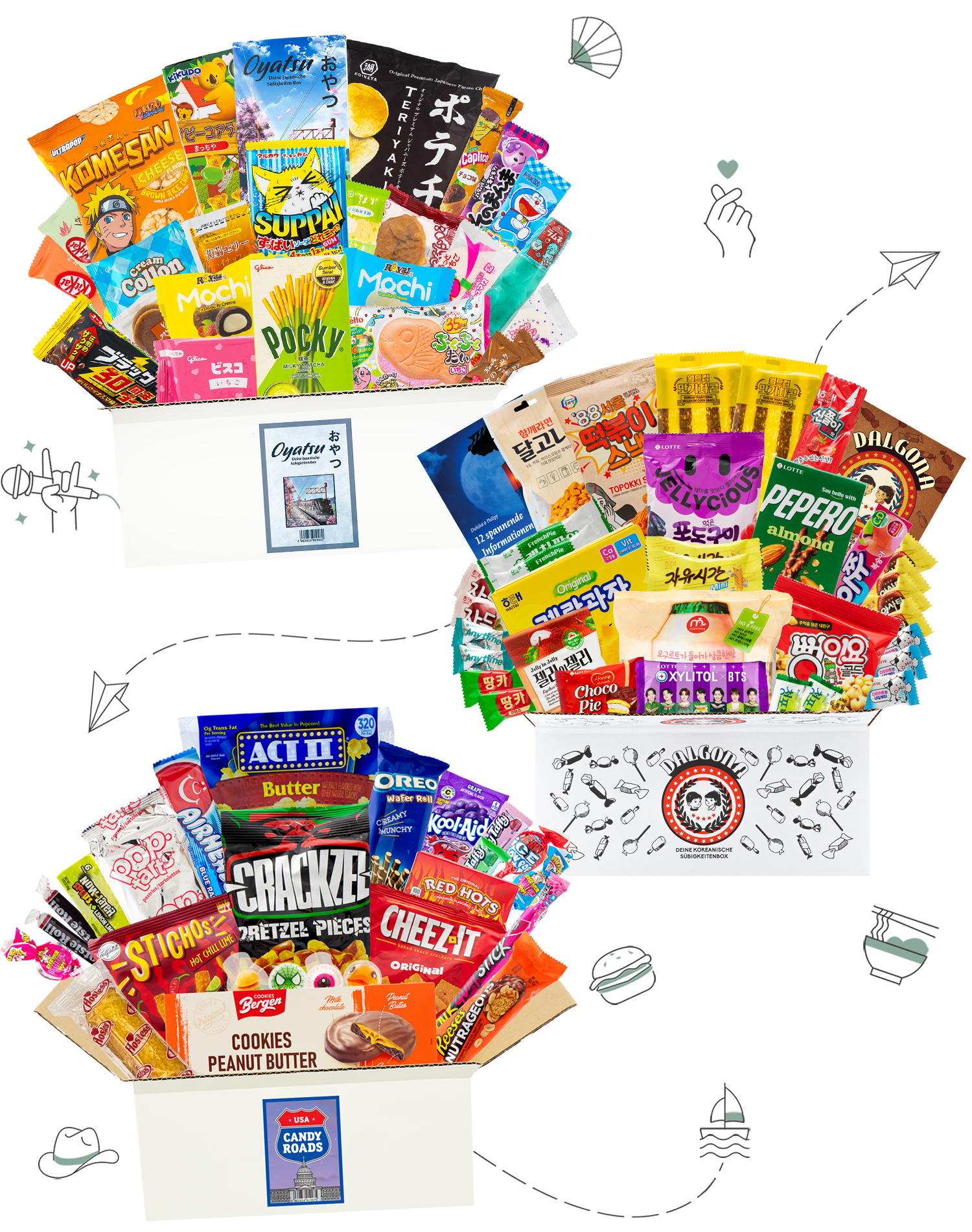 Du kannst dich auf gleich drei abwechslungsreiche Süßigkeiten-Boxen freuen: Mit der Dalgona Box bekommst du über 30 Süßigkeiten aus Korea, die Oyatsu Box bietet dir über 20 Köstlichkeiten aus Japan und mit den über 20 amerikanischen Snacks in der Candy Roads Box begibst du dich auf einen kulinarischen Road Trip durch die Vereinigten Staaten.