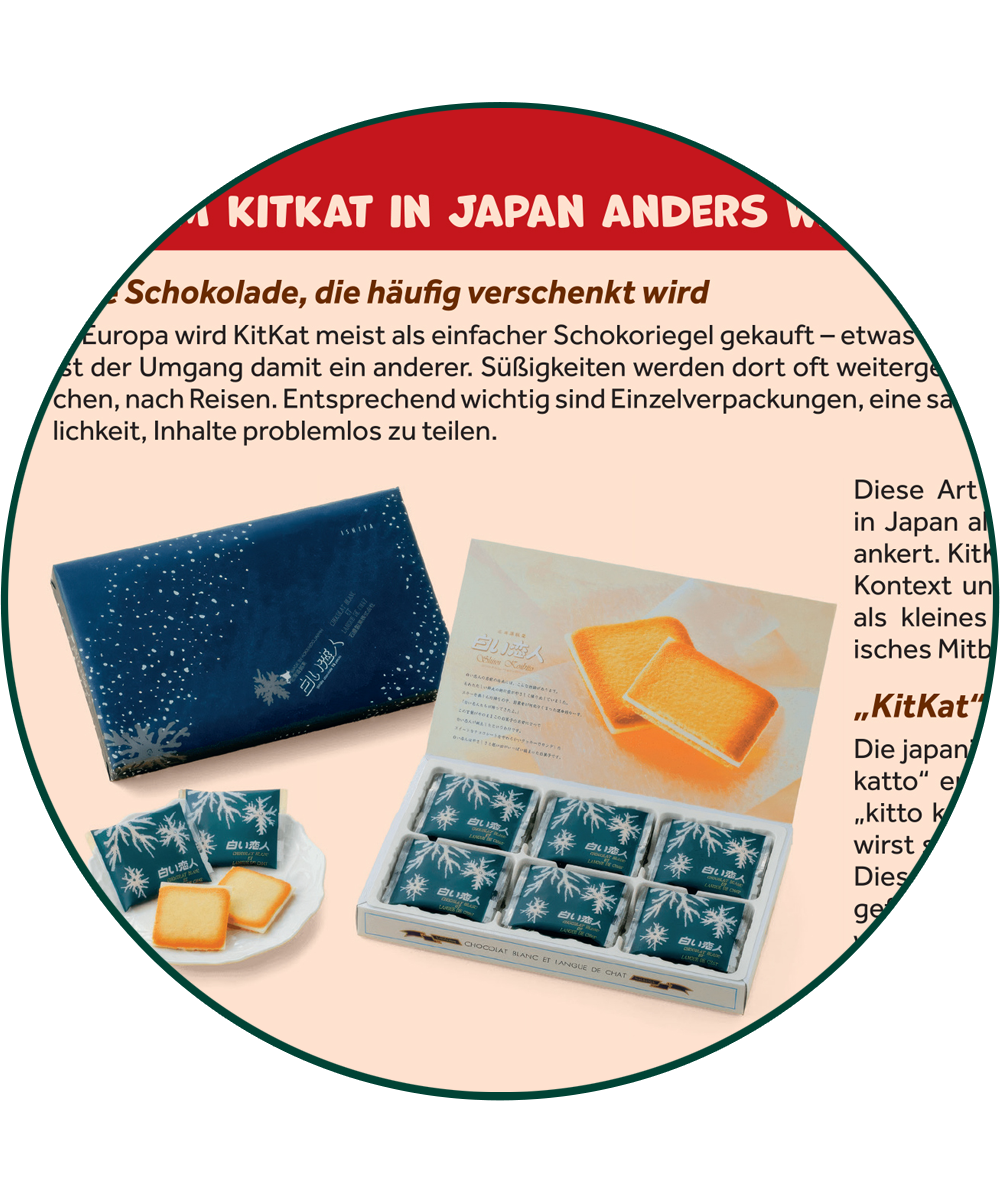 KitKat ist in Japan mehr, als nur eine einfache Süßigkeit. In der beiliegenden Broschüre lernst du Wissenswertes über regionale KitKat-Souvenirs, KitKat-Mail, besondere KitKat-Varianten und vieles mehr!