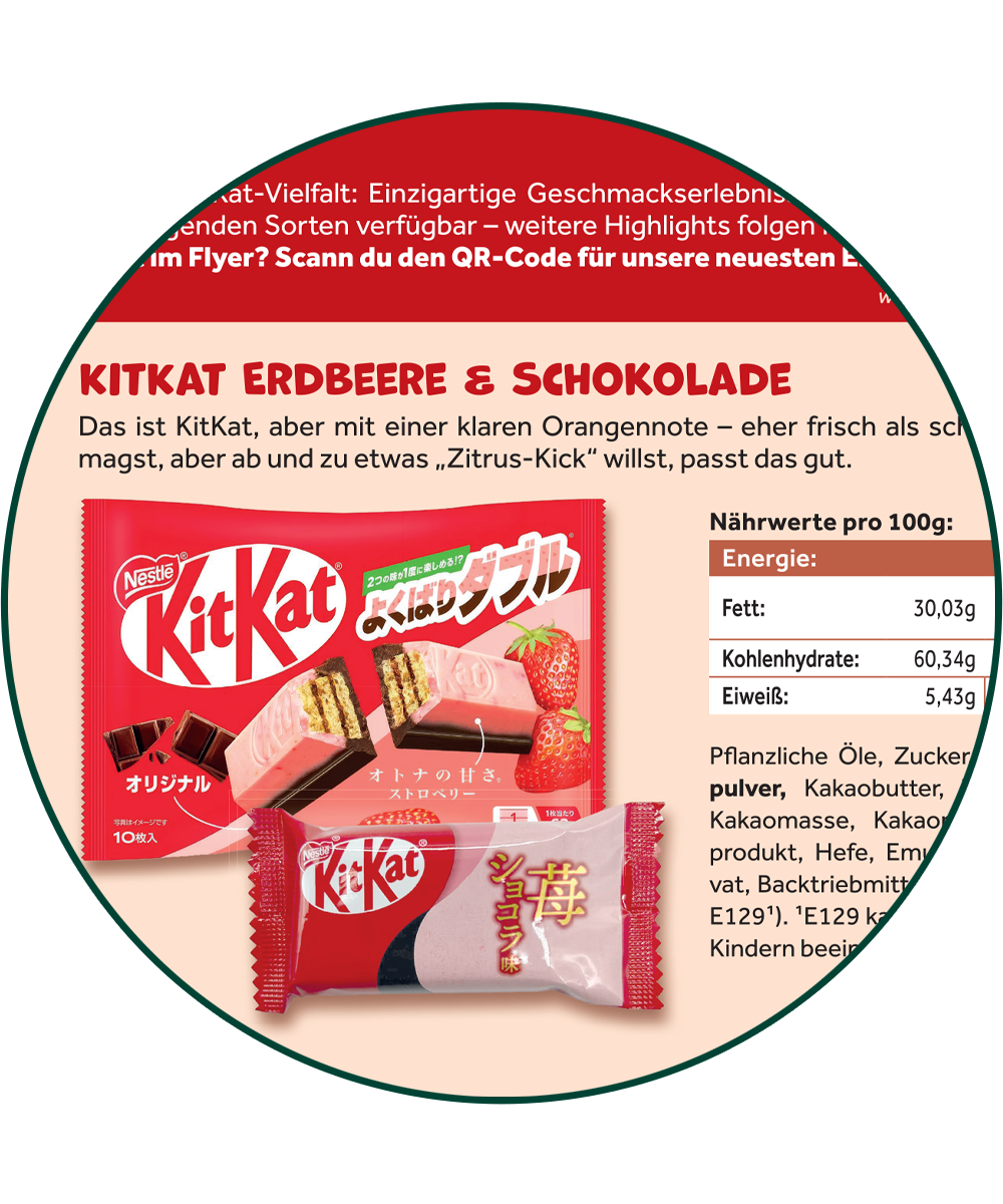 Um dir japanische KitKat-Traditionen näher zu bringen, legen wir dir außerdem eine gratis Broschüre mit in jede Box. In der Broschüre findest du auch alle wichtigen Informationen zu den einzelnen KitKat-Sorten sowie Angaben zu Inhaltsstoffen und Nährwerten.
