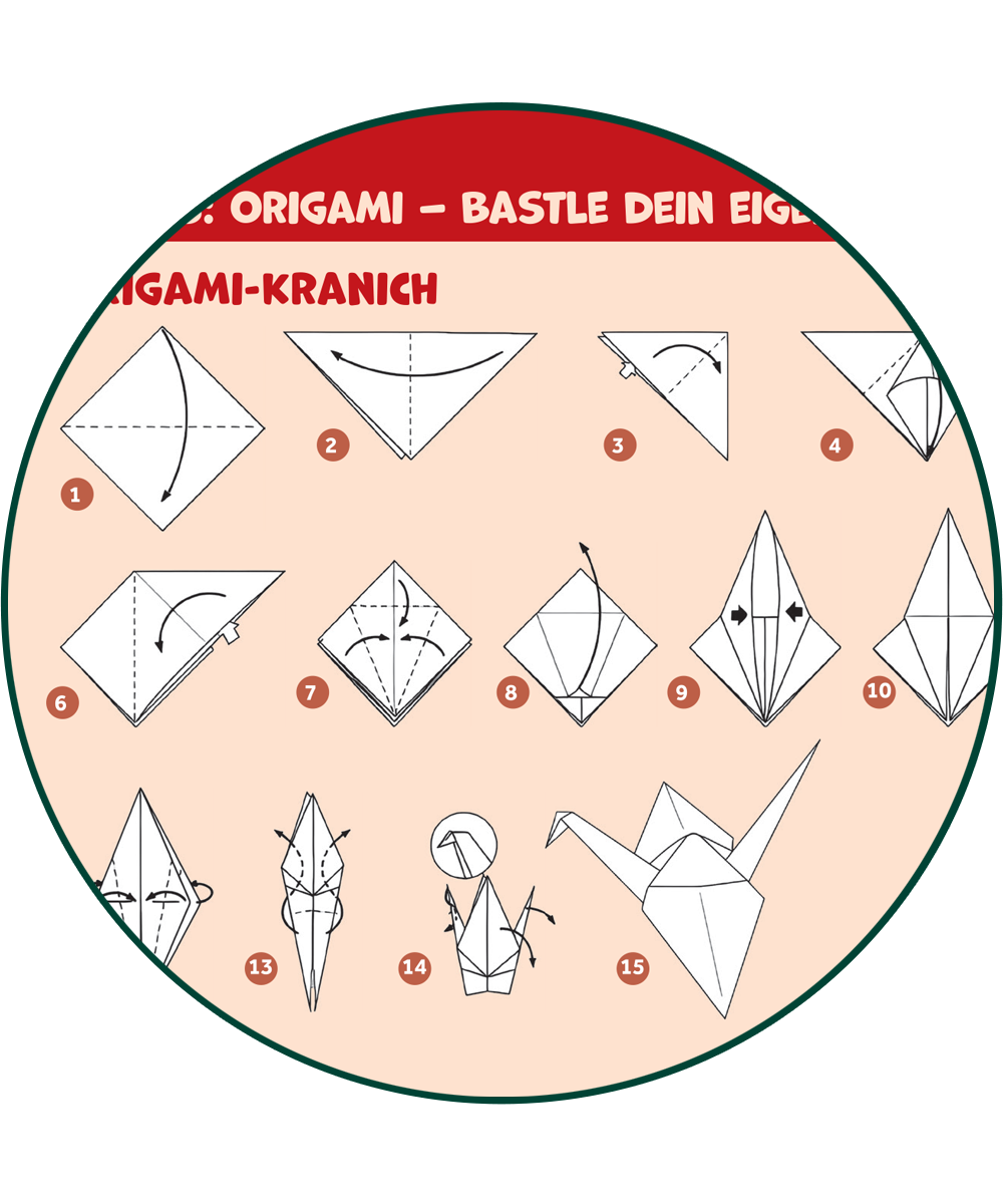 Zusammen mit der Broschüre bekommst du auch eine praktische Bastelanleitung für einen Origami-Kranich. Zusätzlich geben wir dir auch zwei hübsche Origami-Papiere mit - So kannst du direkt mit dem Basteln anfangen!
